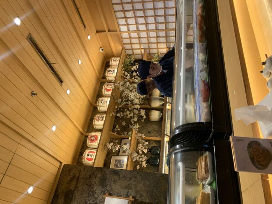 A Japanese restaurant features a display case of sushi. Two chefs wearing surgical masks and chef hats stand behind the case. On the wall is a shelf that displays traditional sake barrels, vases, and framed photographs, all accented by decorative cherry blossoms. The interior design includes wood paneling, a lattice ceiling, and downlighting, creating a warm, inviting ambiance.