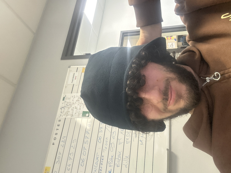 An adult male is depicted in a close-up, selfie-style photograph, partially obscuring his face with a dark bucket hat that covers his eyes and most of his forehead. He has dark, curly hair protruding from beneath the hat and a full beard. He exhibits a faint smile. He is wearing a brown zippered hoodie with a silver 'G' shaped zipper pull. An arm, clad in a brown long-sleeved garment, extends from the right side of the frame, with its hand touching the left side of the bucket hat. The background reveals an indoor office-like environment. A white magnetic whiteboard occupies the left and central portion of the background, bearing handwritten notes in blue and black marker. Prominently displayed in the upper center of the whiteboard is the word "POSTES" in capital letters, indicating a postal facility. Below "POSTES" are various numerical sequences and French words, including "Lille" and "Rotaux," and several phone numbers starting with "06" and "03." A smaller document or diagram is affixed to the whiteboard to the right of "POSTES." Further right, a white rectangular label reading "Track Déchets 6372" (Waste Tracking 6372) is visible. The wall behind the whiteboard is light grey. A dark-framed doorway is partially visible on the far right, leading to another room. The ceiling is a white suspended grid-style ceiling with overhead artificial lighting. Based on the visible "POSTES" signage and regional references like "Lille" on the whiteboard, this scene takes place within a postal facility or a logistics/administrative office related to postal services in the city of Carvin, France.