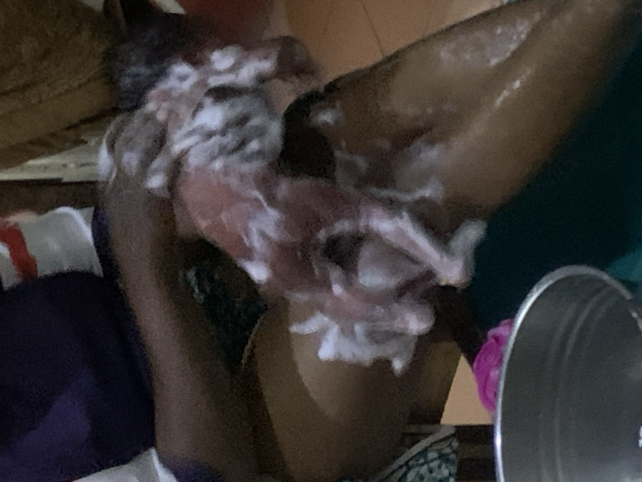 A soapy, red, puppy is being held in someone's hands. It looks like it is being washed. A silver bucket is partially visible on the right. A green garment is in the background along with a striped pillow.