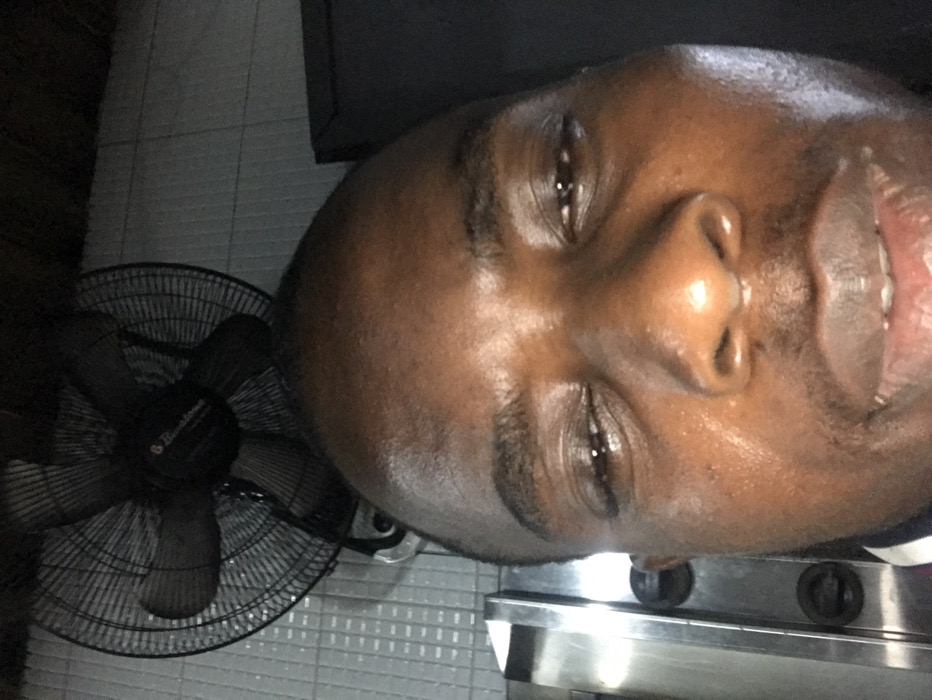 A close-up, dimly lit indoor scene features an adult male subject occupying the majority of the lower frame, captured in what appears to be a selfie. The individual has dark skin, eyes partially closed or squinting, and exhibits a slight smile with visible lower teeth. A dark collar is visible at the bottom left. In the upper background, affixed to a tiled wall, is a black wall-mounted oscillating fan with five blades. The brand "Brushmore" is visible on the fan's central hub. The wall consists of light-colored, possibly white or light grey, rectangular tiles arranged in a grid pattern. To the left of the subject's head and shoulder, a metallic object or appliance, possibly stainless steel, is partially visible, featuring what appear to be black circular controls or fixtures. The overall lighting suggests a somewhat low-light environment. The scene is attributed to a location within the city of Lekki, Nigeria.