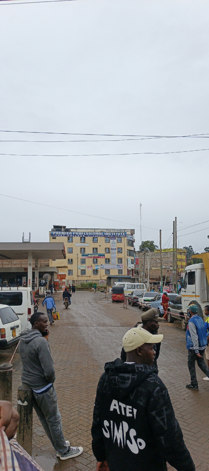 A street scene depicts several people near a gas station and buildings under a cloudy sky. A man in a black hoodie with "SIMPSO" written on the back stands prominently in the foreground. Cars, motorcycles, and a tuk-tuk are visible on the paved road. The building in the background is identified as "PREMIER PROFESSIONAL INSTITUTE TVET COLLEGE". Utility poles and wires stretch across the sky. The overall atmosphere suggests a busy, urban environment.
