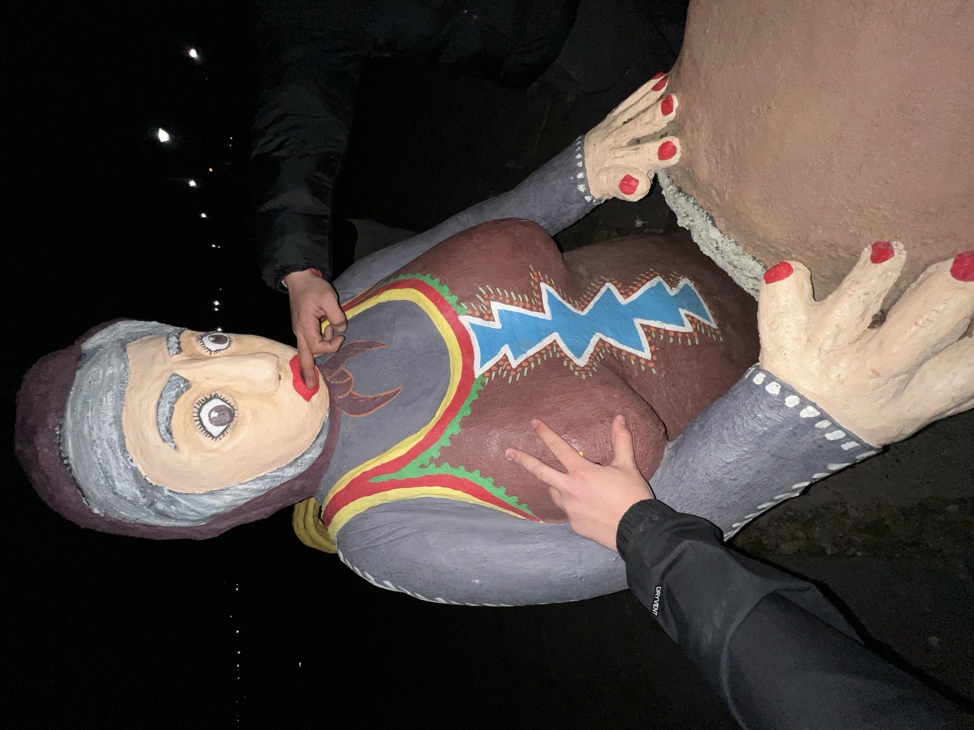 The image displays a large, painted humanoid statue, depicting an older woman, situated outdoors at night in Rakovski, Bulgaria. The statue possesses an exaggerated, light-skinned face with wide, white eyes, black pupils, and red lips. It is clad in a grey long-sleeved garment, over which is a brown vest featuring red, yellow, and green vertical stripes on the shoulders and a prominent light blue zig-zag pattern centrally on the chest. The figure exhibits large breasts and hands with red-painted fingernails. Two human hands are interacting with the statue: one hand, wearing a black long-sleeved garment with "DRYVENT" visible, is placed on the statue's left breast; the second hand, partially visible on the right, touches the statue's lower lip/chin area. The background is dark, indicating a nighttime setting, with several distant, blurred artificial lights visible.