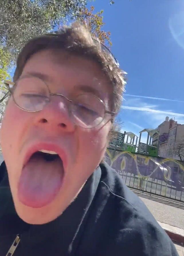 A person with short brown hair wearing glasses and a black jacket is sitting outdoors on a sunny day. They are sticking their tongue out and making a groaning sound. Behind them is a playground with colorful graffiti. There are trees with few leaves around. The sky is blue with contrails.