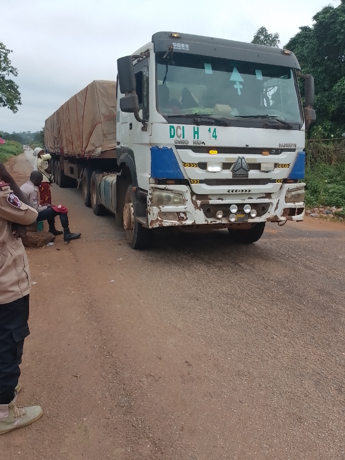 The image depicts a white Sinotruk long-haul truck, labeled "DCI H '14" and "DANGOTE," parked or stationary on a paved road with a dirt shoulder in Ejule, Nigeria