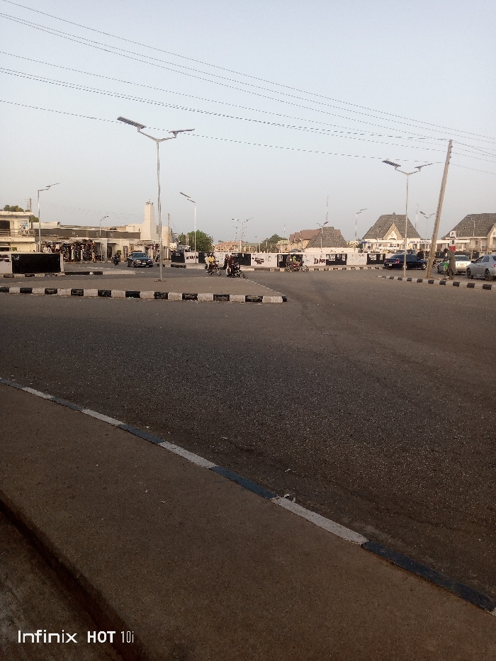 The image depicts an urban street scene within Katsina, Nigeria, the city which is home to Muhammadu Dikko Stadium