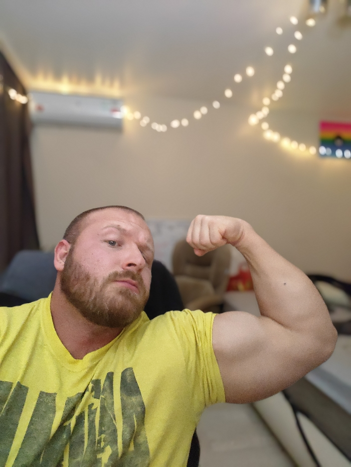 A muscular man with a red beard and short blond hair flexes his bicep, wearing a yellow t-shirt