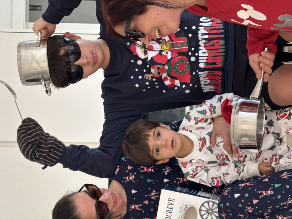 An indoor scene in Junglinster, Luxembourg, depicts four individuals posing in what appears to be a casual, festive setting. On the far left, an adult female with dark hair and dark sunglasses wears a dark blue long-sleeved top patterned with white Christmas figures. She holds a white box, partially labeled "ROCREVE," and looks down with a slight smile. To her right, a young boy with brown hair, wearing a white full-body pajama set patterned with red Santa Clauses and green Christmas trees, sits upright. He looks directly forward with a neutral expression. Behind the young boy and to the right, a teenage male with dark hair and dark sunglasses wears a dark blue long-sleeved "Merry Christmas" sweater featuring stylized Santa Claus and reindeer figures. He has a silver metal cooking pot positioned on his head. His left arm is raised, adorned with a striped brown and white oven mitt, holding a long, silver metal serving spoon upwards. His right hand is obscured, possibly resting on another individual. On the far right, an adult female with reddish-brown hair and dark sunglasses wears a red long-sleeved top, partially visible with a white Mickey Mouse outline. She smiles broadly while looking towards the left. Her left hand holds a small, silver metal saucepan that contains a small red fabric object, possibly a miniature Santa hat. The background consists of a plain, light-colored wall. The overall lighting is bright and uniform.
