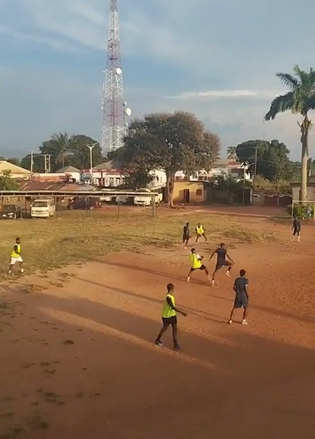 A wide shot shows several people playing soccer on a dirt field. Some of the players wear yellow vests, while others wear dark shirts and shorts. In the background, there are buildings, trees, a tall transmission tower, and a palm tree on the edge of the field. The sky is partly cloudy and it appears to be late afternoon.