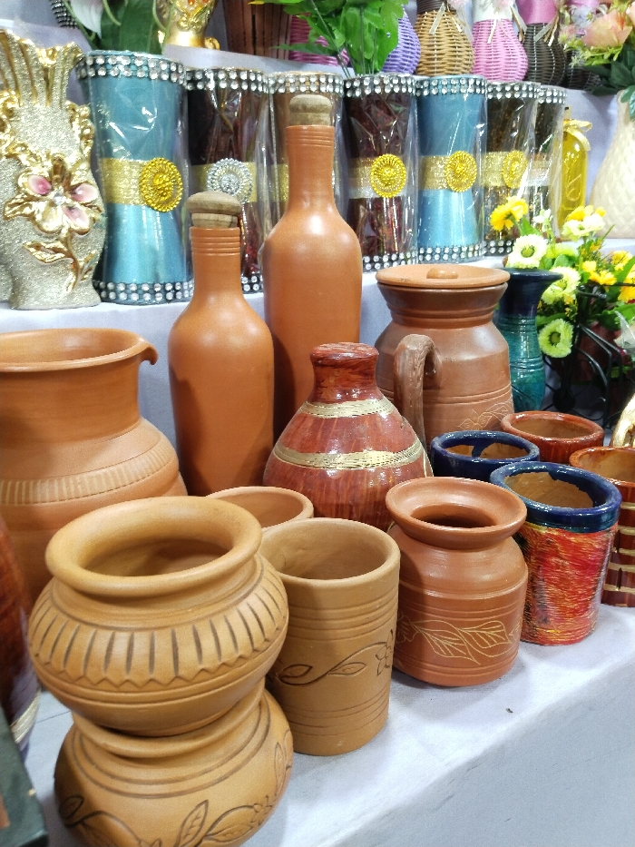 display of terracotta pottery arranged on a table