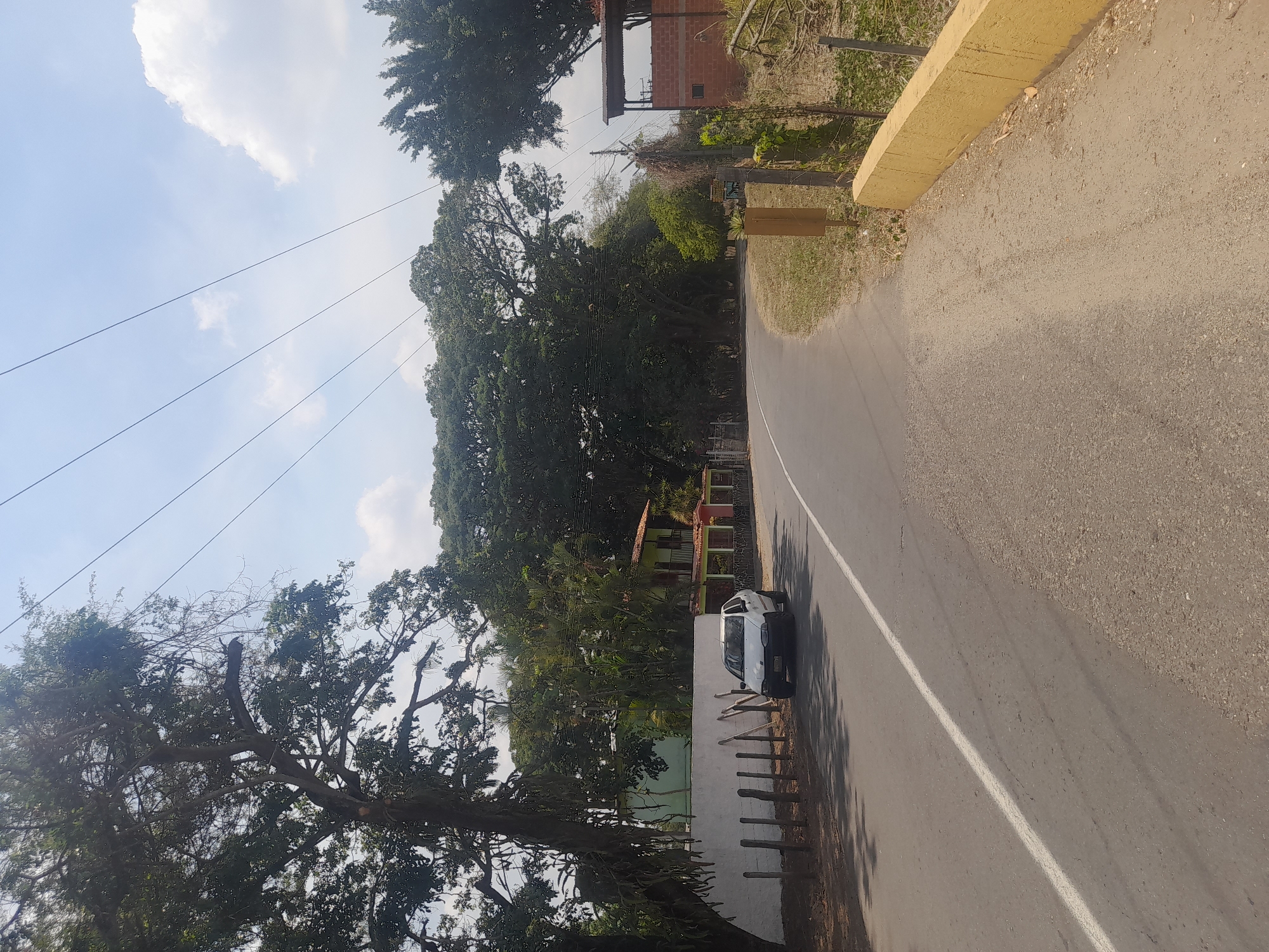 The image displays an outdoor scene on a clear, sunny day in Vallecito, Venezuela. A paved road, marked by a solid white line on its left side, curves gently to the right and recedes into the distance. The road's surface is grey asphalt with a rough, unpaved dirt shoulder on the right. On the left side of the road, a large, mature tree with dense green foliage and visible parasitic growth dominates the foreground. Beneath the tree, a low, white-painted concrete wall is partially visible, fronted by several irregularly spaced wooden fence posts. A white two-door hatchback vehicle is parked facing away from the viewer, positioned between the wooden posts and the white wall. Behind the wall and interspersed with dense tropical vegetation, a multi-story building with a light green wall and a red-orange balcony railing is partially visible. Overhead, multiple black utility lines extend diagonally across the sky. On the right side of the road, a low, yellow concrete barrier runs parallel to the unpaved shoulder. Beyond this barrier, the ground is covered with dry, yellowish grass and sparse green vegetation. Further back, a partial structure constructed from reddish-brown bricks with a corrugated metal roof is visible. A wooden utility pole and a wire fence are also present on this side. The background on both sides of the road is characterized by dense clusters of lush green trees. The sky is predominantly clear blue with scattered white cumulus clouds. Strong shadows on the road and ground indicate direct sunlight. No individuals or active subjects are depicted in the scene.