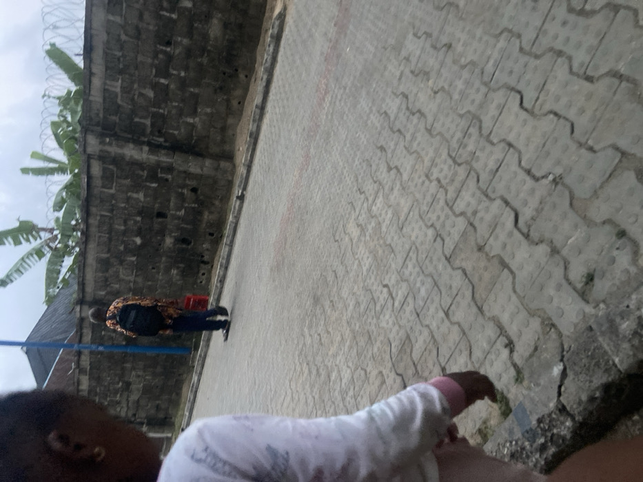 The scene depicts an outdoor urban environment in Yenegoa, Nigeria, from a low vantage point. In the immediate foreground, the partial back of a subject is visible, showing a white long-sleeved top with subtle patterns and a pink cuff trim, along with a small gold earring on the right ear. The subject's left hand is positioned near the ground next to a concrete curb. In the midground, an adult subject is observed walking away from the camera, moving towards the left. This individual wears a multi-patterned long-sleeved shirt, dark trousers, and dark sandals. A black backpack is worn, and a red plastic crate is carried in the subject's left hand. The ground consists of grey interlocking concrete blocks patterned with small raised circles. A concrete curb runs parallel to the path, separating the paved surface from a narrow strip of soil where sparse green weeds are present. A dark grey concrete block wall, showing signs of weathering and staining, forms the background, topped with multiple coils of barbed wire. Above the wall, green banana leaves are visible. To the far left, a blue pole and the dark corrugated metal roof of a building are present. The sky is uniformly overcast.