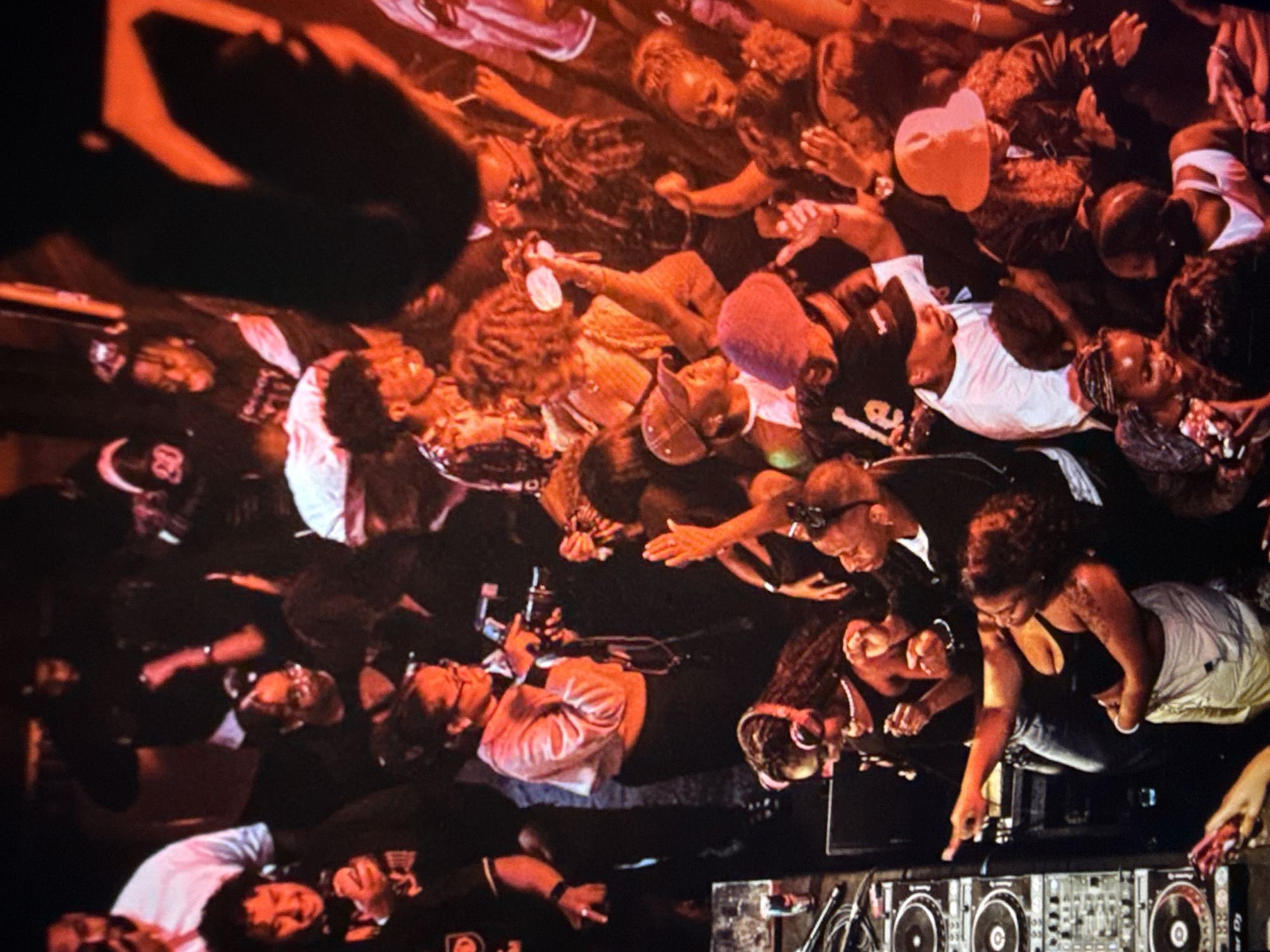 Aerial view of a crowded event, likely a party or concert, with people's faces, hands, and arms visible