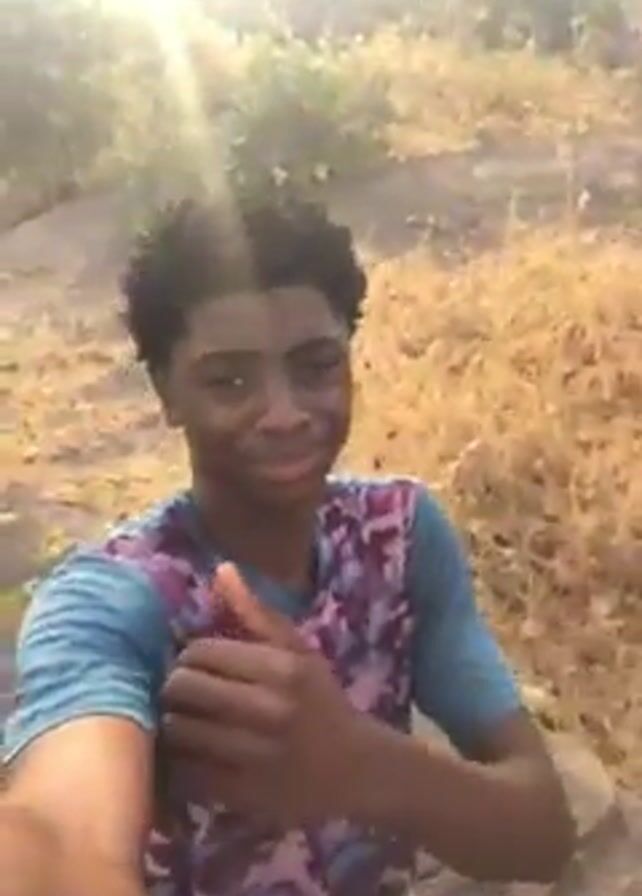 young, dark-skinned person with short, curly hair, wearing a blue t-shirt with a patterned camouflage design. They are outdoors in a field with dry, yellow grass and some scattered vegetation, possibly on a hill or elevated area, as the background appears sloped. The person is holding the camera at arm's length, taking a selfie-style video. They make various hand gestures and facial expressions. In the background, another person is briefly visible. The lighting is bright, and there is a visible sun glare in the upper part of the frame.