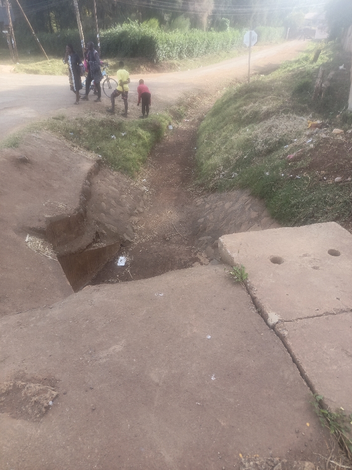The image depicts an outdoor scene in Ngong ward, Kenya, characterized by an unpaved road intersection, a significant drainage gully, and five individuals present during daylight hours. **Environment:** The foreground features two concrete slabs, likely covering a portion of a drainage ditch or culvert. The left slab is broken and appears to be part of a larger, partially collapsed structure, exposing a deep, earthen channel. The right slab, roughly rectangular, exhibits two circular depressions and is separated from the left by a crack with sparse vegetation. The ditch itself is unlined earth with grass growing on its banks, extending from the left foreground towards the mid-ground. Debris and litter are scattered within the ditch and on its banks. Beyond the ditch, an unpaved, reddish-brown dirt road curves left into the distance. A secondary unpaved path or driveway branches off to the right. The road is flanked by utility poles on the left and dense green foliage (bushes and trees) on the right. A faded circular sign on a pole is visible on the right side of the main road. The sky is bright, with noticeable lens flare in the upper right quadrant, indicating sunlight from the upper right. **People and Objects:** Five individuals, appearing to be African, are positioned near the road junction. 1. **Group 1 (left):** Three individuals stand on the left side of the dirt road. One person wears dark clothing with a white pattern and stands next to a bicycle. The bicycle has a light-colored frame and dark tires. Two other individuals in dark clothing stand nearby, facing towards the right. 2. **Group 2 (right):** Two individuals are closer to the ditch. One person wears a bright yellow short-sleeved top and dark trousers/shorts, standing facing away from the camera, observing the area. The other, appearing younger, wears a reddish-brown top and dark trousers/shorts, bending forward at the waist and leaning over the edge of the drainage ditch, seemingly looking into it or at the ground. **Actions and Interactions:** The three individuals on the left appear to be standing idly or conversing. The person in the yellow top is standing upright, observing. The person in the reddish-brown top is actively leaning over the ditch. No direct interaction is evident between the two distinct groups of individuals.