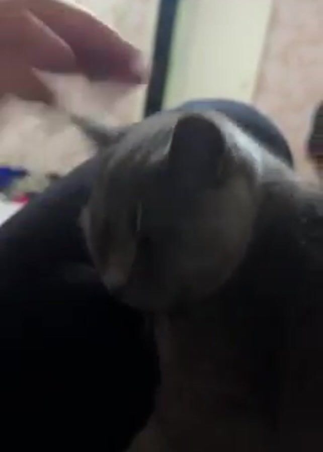 A close-up video shows a gray cat being petted on its head by a person's hand