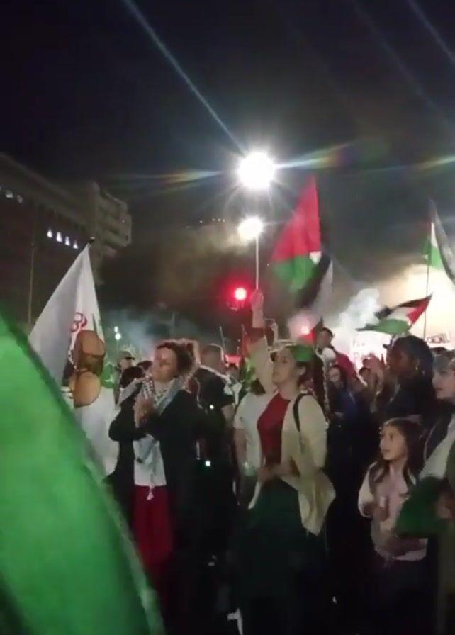 At night, a crowd of people, including a young girl, are waving flags with red, white, and green colors in a city street. A street light provides illumination, causing a starburst effect. Smoke is visible in the background. The crowd appears to be chanting and clapping.