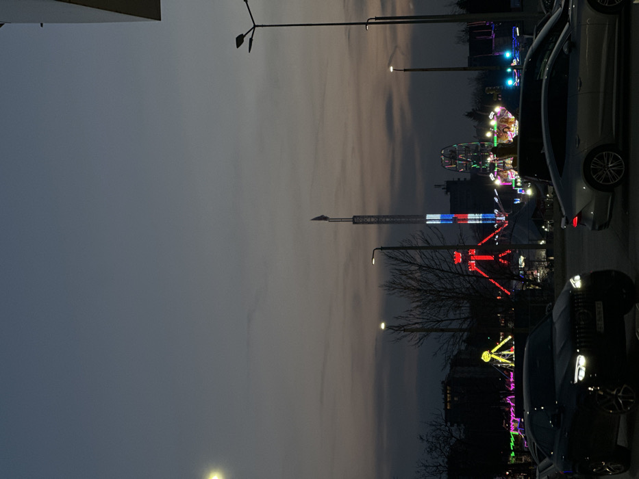 The image depicts an urban scene at dusk or early night in Veliko Tarnovo, Bulgaria. In the foreground, two automobiles are prominent: a dark-colored Mercedes-Benz AMG coupe SUV with illuminated headlights is positioned on the left, facing towards the viewer's right, and a silver Audi A7 is visible on the right, oriented left, with its side profile partially obscured by a dark vehicle in front of it. The middle ground features bare deciduous trees, indicative of late autumn or winter, interspersed with multiple streetlights, some of which are illuminated. The background is dominated by a temporary amusement park or fairground, brightly lit with various attractions. A tall vertical tower structure, illuminated with red, white, and blue lights in a vertical stripe pattern, stands prominently near the center, topped by a dark flag. To its left, a large red-colored amusement ride with an inverted V-shape is active. Further to the right, a Ferris wheel with multi-colored lights and other smaller, intensely illuminated rides are visible. Silhouettes of distant buildings are discernible beneath the horizon line. The sky is a gradient of dark blue transitioning to lighter shades near the horizon, with faint cloud formations. No individuals are clearly identifiable within the frame. The overall environment suggests an active entertainment venue within an urban setting during low-light conditions.