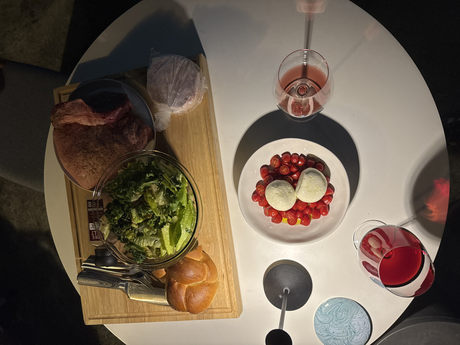 A white, circular table is depicted from a top-down perspective, presenting a meal setup under artificial lighting that casts distinct shadows. The exact location within New York City, United States, cannot be determined from the visual information provided. Central to the table is a large, light-colored wooden cutting board. On this board, from left to right, are: * A set of kitchen utensils, including knives and forks, with silver and dark-patterned handles. * A clear glass bowl containing a salad primarily composed of green leafy vegetables. * A white ceramic plate holding a large cut of raw meat, likely beef, with a reddish-brown seasoned surface. * A small, circular item wrapped in clear plastic film, possibly a food item. * A golden-brown braided loaf of bread. Arranged on the white table surface surrounding the cutting board are: * At the bottom, a white ceramic bowl containing numerous small red cherry tomatoes and two large, oval-shaped pieces of fresh mozzarella cheese, with a visible drizzle of olive oil. * To the right of the mozzarella, an upright wine glass holds rosé-colored liquid. * To the bottom-left, another wine glass is positioned on its side, containing dark red liquid, with reflections of red light visible on its surface. * To the far left, a light blue and white marbled coaster is visible. * Adjacent to the coaster, a black, circular base of what appears to be a lamp or a stand. The background is dark and out of focus, suggesting an evening or night setting, possibly outdoors or in a dimly lit interior space. A blurred, light gray upholstered item, likely a chair, is partially visible in the upper background. No individuals are present in the image.