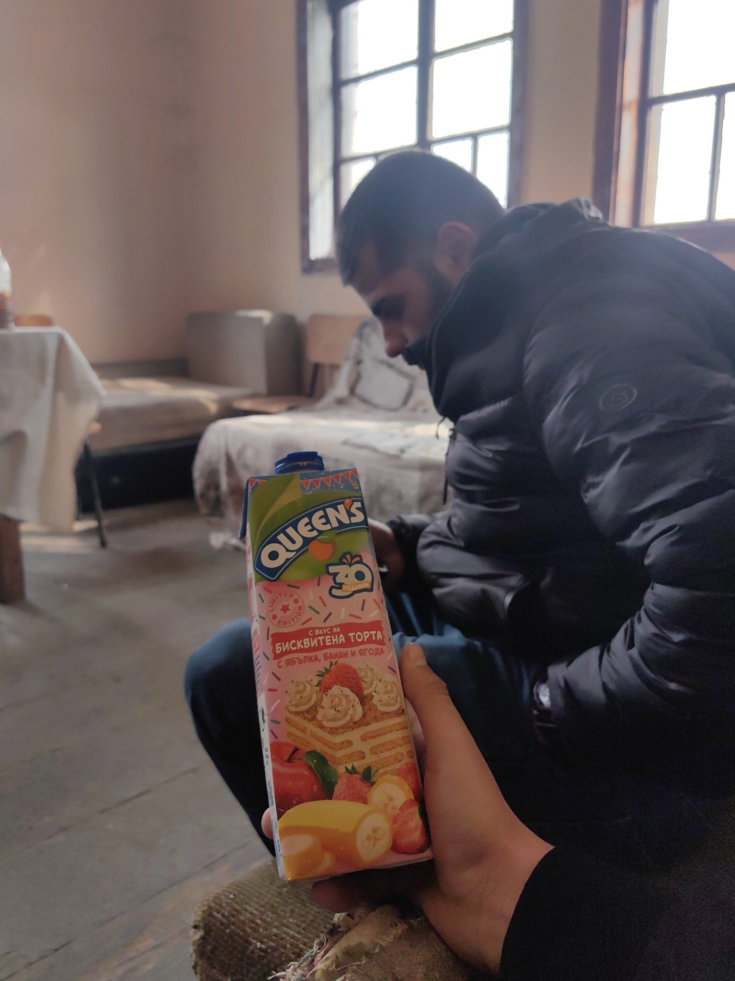 The photograph captures a person holding a carton of Queen's brand juice in front of them. The carton features an image of a cake and is labelled in Cyrillic script, indicating it is a product for the Bulgarian market. The label reads "С вкус на бисквитена торта с ябълка, банан и ягода," which translates to "Biscuit cake flavor with apple, banana, and strawberry." Behind the person holding the juice carton, another individual is seated, wearing a dark, puffy jacket. The background reveals a somewhat sparse interior with beds and furniture, suggesting a residential setting. A window provides natural light, indicating it is daytime. Based on the product label and the information provided, it's likely that the location is Sennik, Bulgaria. The overall scene suggests a casual, everyday moment, with someone enjoying a juice drink in a simple domestic environment.