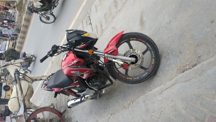 The image displays an urban street scene in Quetta City Tehsil, Pakistan, during daylight hours. In the foreground, a red and black Honda motorcycle is parked on a cracked concrete sidewalk, facing toward the left side of the frame. The motorcycle features black alloy wheels with yellow and red accents, a front disc brake, and a chrome exhaust. A yellow smiley face sticker is visible on its front cowling. Behind the parked motorcycle, on the same sidewalk, a white donkey harnessed to a wooden, two-wheeled cart with a red wheel is standing stationary. The sidewalk abuts a paved road, separated by a yellow and black striped curb. On the road, a male individual wearing a green jacket is riding a dark motorcycle away from the camera. Further down the road, another motorcycle and a white three-wheeled auto-rickshaw are visible, along with indistinct figures and commercial buildings lining the street. The overall environment depicts a busy urban thoroughfare.