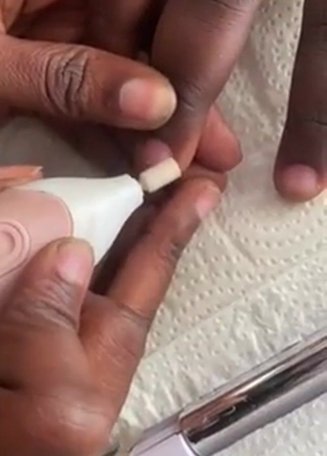 A close-up shot shows a pair of dark-skinned hands operating an electric nail file on a fingernail