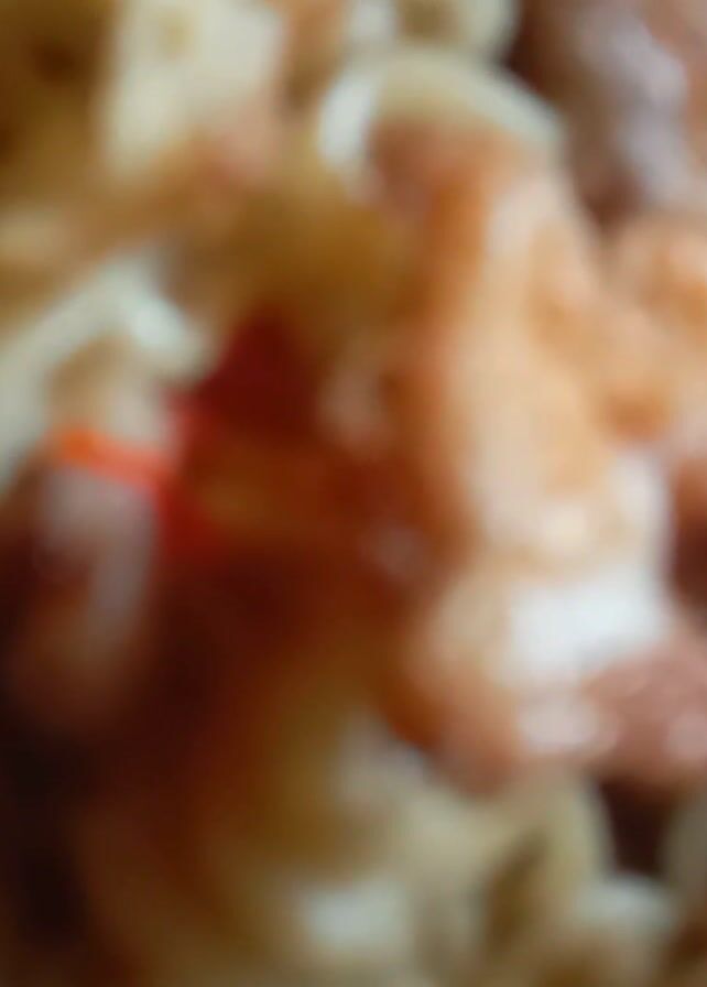 plate of noodles topped with fried egg. The noodles are a light tan color and are slightly coiled. There are small pieces of red vegetable mixed in with the noodles. The fried egg is brown and bubbly on top, with some white egg visible. The plate is yellow and is placed on a surface with a black and white pattern. A silver fork is also visible on the plate. The video starts out of focus and then comes into focus.