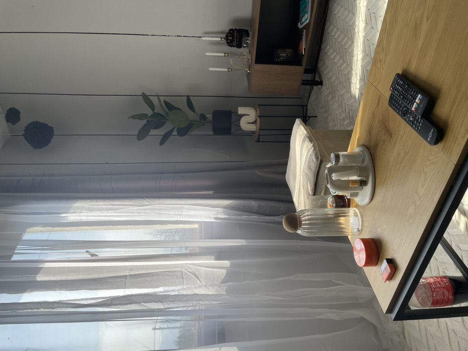 This interior scene depicts a living room or common area in the city of Septemvri, Bulgaria, illuminated by natural light from a large window on the left. The foreground features a rectangular wooden coffee table with a black metal frame. On the table are: a ribbed glass carafe with a cork stopper, a glass containing a dark liquid, a small round orange container, a small rectangular orange box, a white irregular ceramic tray holding two small white shakers and a dark cylindrical object, and two black remote controls. A red Coca-Cola bottle is visible on a lower shelf beneath the table. Behind the coffee table, a light-colored upholstered square stool or pouf is positioned. The left wall features a large window draped with sheer white and heavier grey curtains, revealing a faint view of bare trees and distant structures outside. The right wall is light-colored with vertical black decorative strips. Two dark, spherical decorative objects hang from the ceiling. In the mid-ground, a black-potted Ficus plant rests on a small, round wooden-topped side table with black metal legs. Below it, another identical side table holds a white, abstract 'N'-shaped decorative object. Further to the right, a low, light-colored wooden console cabinet with black legs displays a gold candelabra with three white candles, a smaller golden wireframe ornament, and a black decorative item with a "Ramadan" tag. The floor is covered by a light-colored patterned rug. No individuals are present, and no actions or interactions are depicted.
