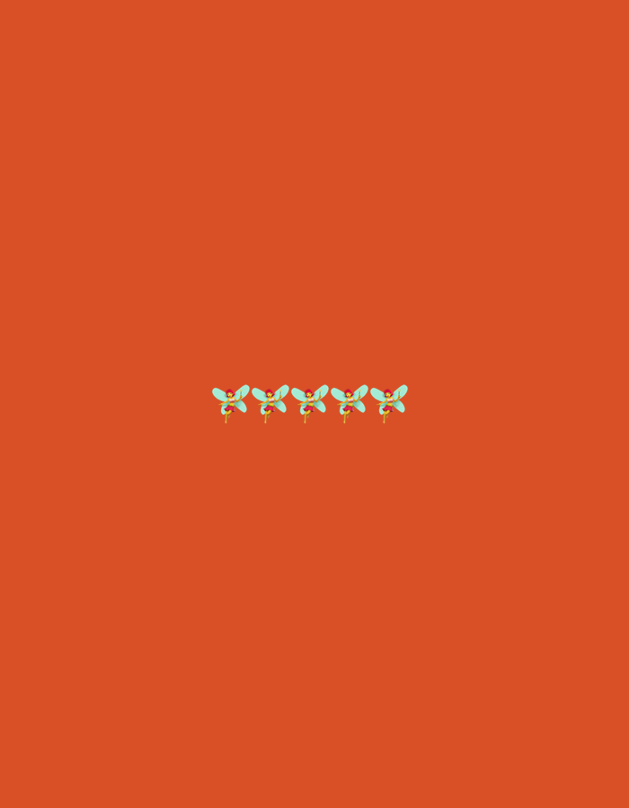 This image depicts a uniform orange background. Centered horizontally on this background are five identical digital representations of winged fairies, commonly referred to as emojis. Each fairy figure has a red body, light blue wings, and a golden-yellow head or hair, appearing in a static, flight-like posture. They are arranged in a linear formation, equidistant from each other. There is no discernible physical location or environment from the city of Torrent, Spain, depicted in this image; it is a digitally composed graphic. No people, actions, or interactions beyond the static arrangement of the emoji subjects are present.