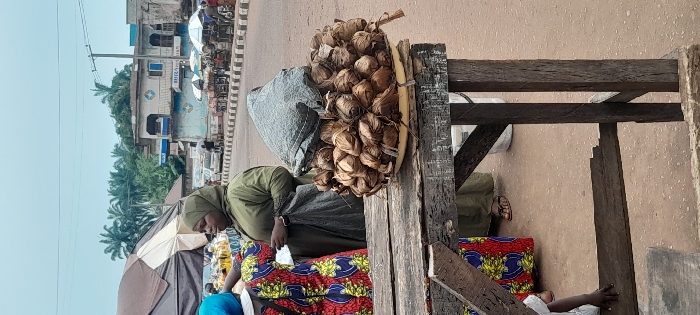 The image depicts an outdoor market scene in Tuaniako, Nigeria, under an overcast sky