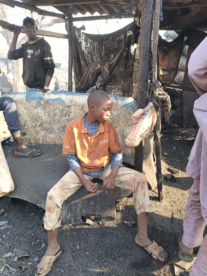 The scene is located in Fagge D2, Nigeria, depicting an outdoor, informal workspace under a makeshift shelter