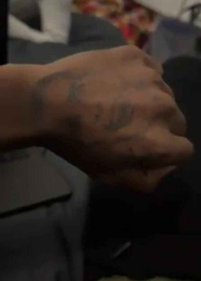 The video focuses on a person's hand with a tattoo of a face on it. The tattoo is black and appears somewhat faded. The hand is dark-skinned and has visible hair. The person holding the hand seems to be sitting down, possibly on a couch or bed, as indicated by the soft furnishings in the background. The background is blurry and shows hints of clothing or blankets. The sound in the video appears to be a low buzzing noise.