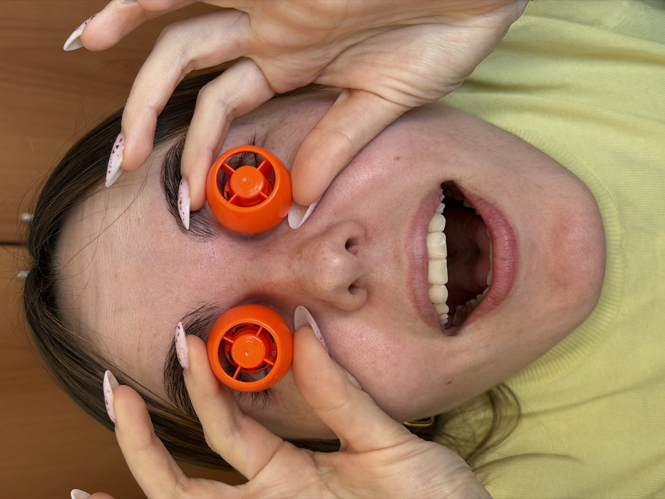 A close-up, frontal image depicts a young adult female, observed indoors in Izhevsk, Russia. She is actively holding two small, bright orange, spherical objects, each featuring a gridded or fan-like internal structure, over her eyes. Her hands, with fingers positioned around the objects and her eye sockets, are visible. Her fingernails are long, almond-shaped, and painted with a light base coat speckled with darker dots. Her mouth is open wide, exposing her upper and lower teeth and the back of her oral cavity, indicating an expression of exaggerated surprise or amusement. Her complexion is fair, with visible freckles on her nose and cheeks. She wears a yellow, ribbed-neck garment, and a gold hoop earring is visible on the viewer's right side of her face. The background is an out-of-focus, solid light brown surface.