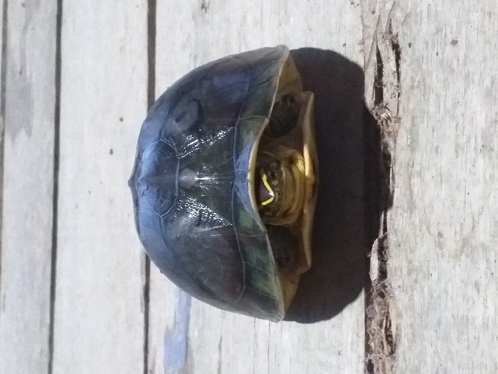- "A small turtle is centered on a light-colored wooden plank surface under direct illumination, casting a distinct dark shadow beneath it" by FM-lMQUs2, licensed under CC BY 4.0
