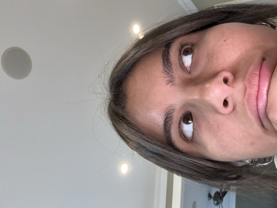 The image displays a close-up, bottom-up perspective of an individual's upper face, primarily from the nose upwards. The subject has dark brown hair, parted centrally, with several fine strands visible extending above the forehead. Her brown eyes are directed upwards and to the viewer's right, showing the whites of the eyes. Her eyebrows are dark and full. The lower lip is pushed upwards, creating a pout, and a portion of a hand is visible supporting the chin. A silver-colored hoop earring is present on the left side of her face. The background consists of a light-colored ceiling featuring two illuminated recessed circular lights and one larger, unlit circular recessed fixture. A dark ceiling fan blade is partially visible in the upper left quadrant, and a section of decorative wall molding is present on the left side of the frame. The scene is indoors, but no specific location within Princeton, United States, is identifiable from the visual content.