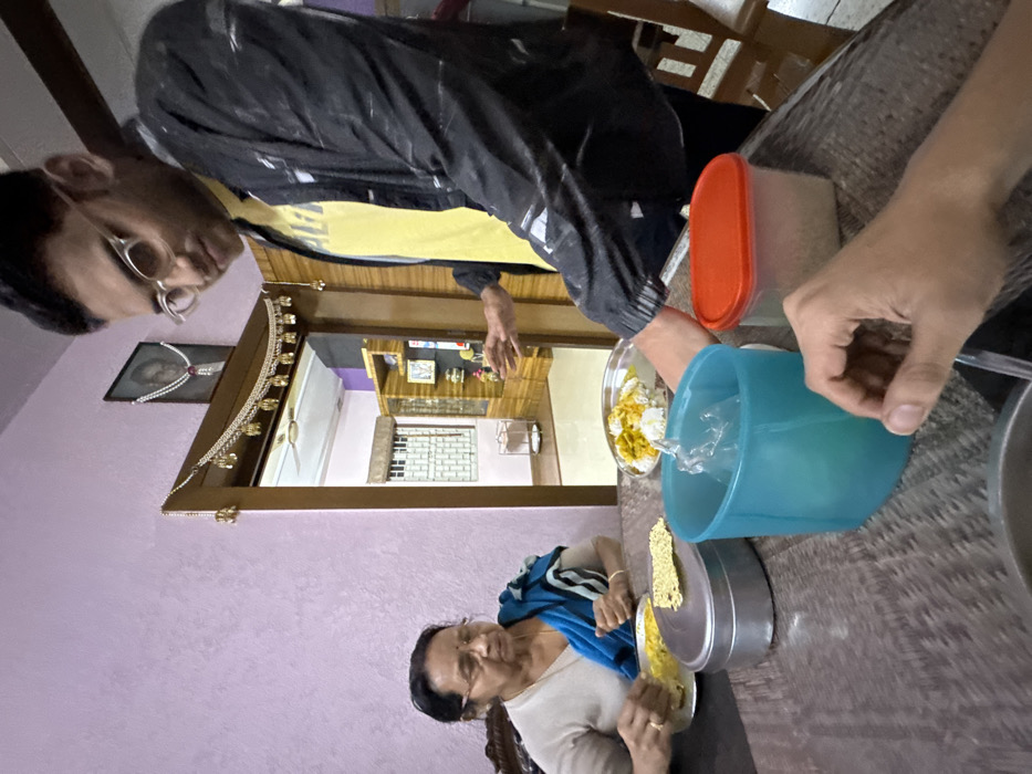The image depicts an indoor scene within a residence in Kolkata, India, involving three individuals around a dining table