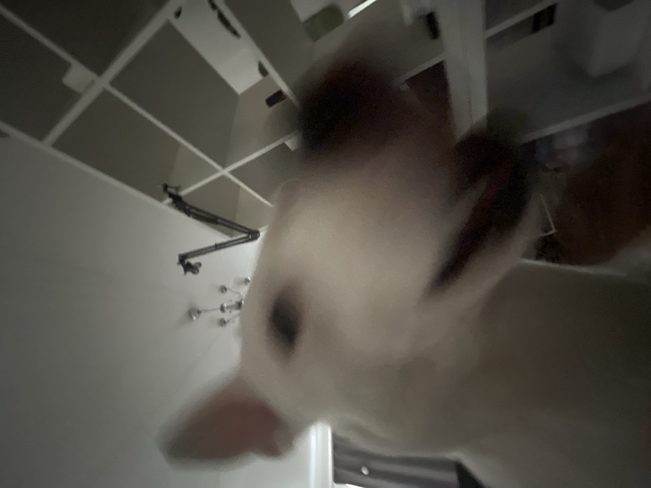 The scene depicts a close-up, low-angle view of a white Bull Terrier dog indoors in Saint Petersburg, Russia. The dog's head is prominent in the foreground, with its left eye visible and its mouth slightly open, showing a dark interior, indicative of either panting or a playful expression. The dog's features appear slightly blurred, suggesting either motion or a shallow depth of field. In the background, a light-colored ceiling features a multi-bulb chandelier. To the upper left, a dark curtain is visible, possibly indicating a window. To the right, a white shelving unit with multiple compartments is partially visible, extending diagonally. A black articulated arm, possibly a microphone or camera boom, is mounted near the ceiling. The environment appears to be an interior space, likely residential, with ambient lighting.