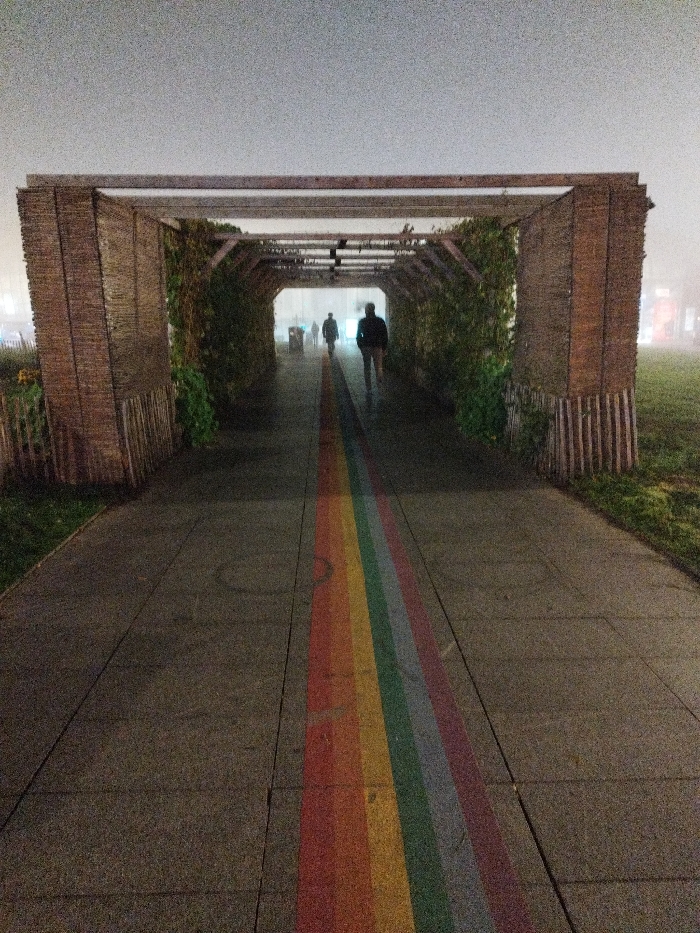 This image depicts an outdoor pedestrian pathway in Strasbourg, France, under conditions of low light and dense fog. A paved walkway, composed of gray concrete slabs, extends into the distance, centrally marked by a painted six-stripe rainbow pattern (red, orange, yellow, green, blue, purple). The path is enclosed by a wooden pergola-style tunnel structure, its multiple sections supported by beams wrapped in woven material, possibly bamboo or reeds, and extensively covered with green climbing foliage. Multiple human figures are observed walking away from the viewer, proceeding along the rainbow-painted path and deeper into the fog-shrouded structure. The nearest visible individual is a dark-clad silhouette, followed by other less distinct figures further down the tunnel. Grass verges flank both sides of the pathway, with a low wooden fence partially visible on the left side, adjacent to the pergola's base. Distant artificial lights are diffused by the fog, creating a hazy glow in the background.