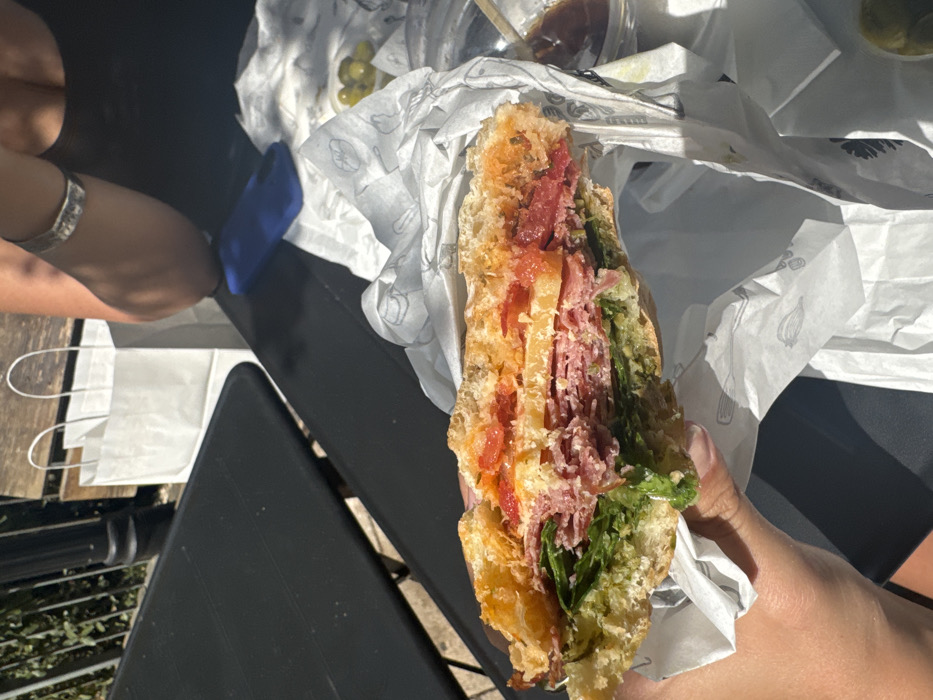 An overhead-angle shot shows a sliced sandwich held in a person's left hand at an outdoor table