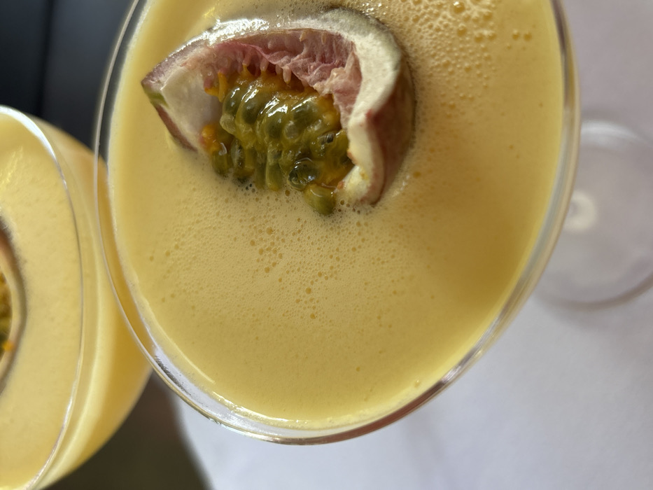The image presents two clear, stemmed cocktail glasses, likely coupe or martini style, each containing a vibrant yellow, frothy beverage. The foreground glass is in sharp focus, showcasing a thick layer of small, uniform bubbles on the opaque liquid's surface. A cut wedge of passion fruit serves as a garnish, with its characteristic reddish-purple rind and translucent green-yellow pulp, containing dark seeds, partially submerged in the drink. A second, identical drink is visible in the background, out of focus, similarly garnished. The immediate surface beneath the front glass appears light-colored, consistent with a white or off-white tabletop or tablecloth, while the background beyond the second glass is dark and indistinct. No people, specific actions, or identifying architectural features are present to determine a precise location within Yerevan, Armenia.