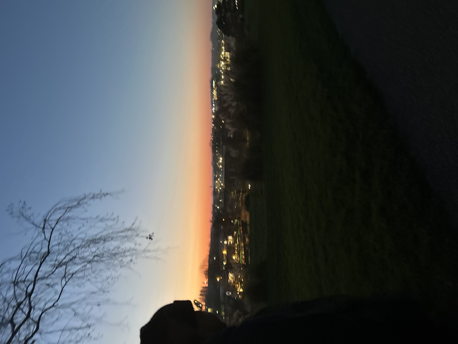 A landscape view under a twilight sky showcasing a gradient from blue to orange hues. An urban scene with illuminated buildings stretches across the horizon. Bare tree branches frame the left side of the image. A grassy field slopes to the right, transitioning into a dark, paved surface. The lower portion of the photograph includes a silhouette of a person's head and shoulders.