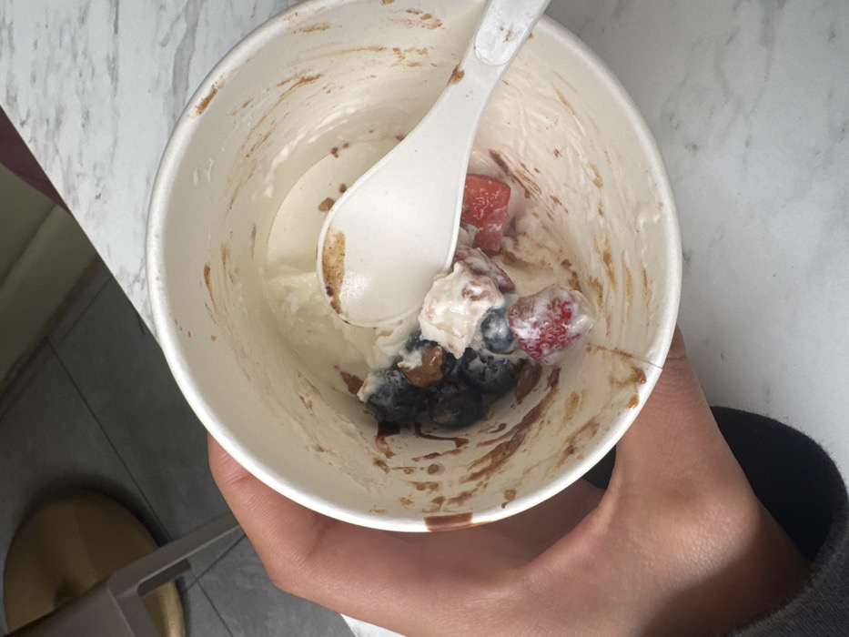 - "A close-up, high-angle view depicts a partially consumed dessert within a white paper cup, held by a light-skinned hand gripping the cup from the left side" by FM-BS4Ql2, licensed under CC BY 4.0