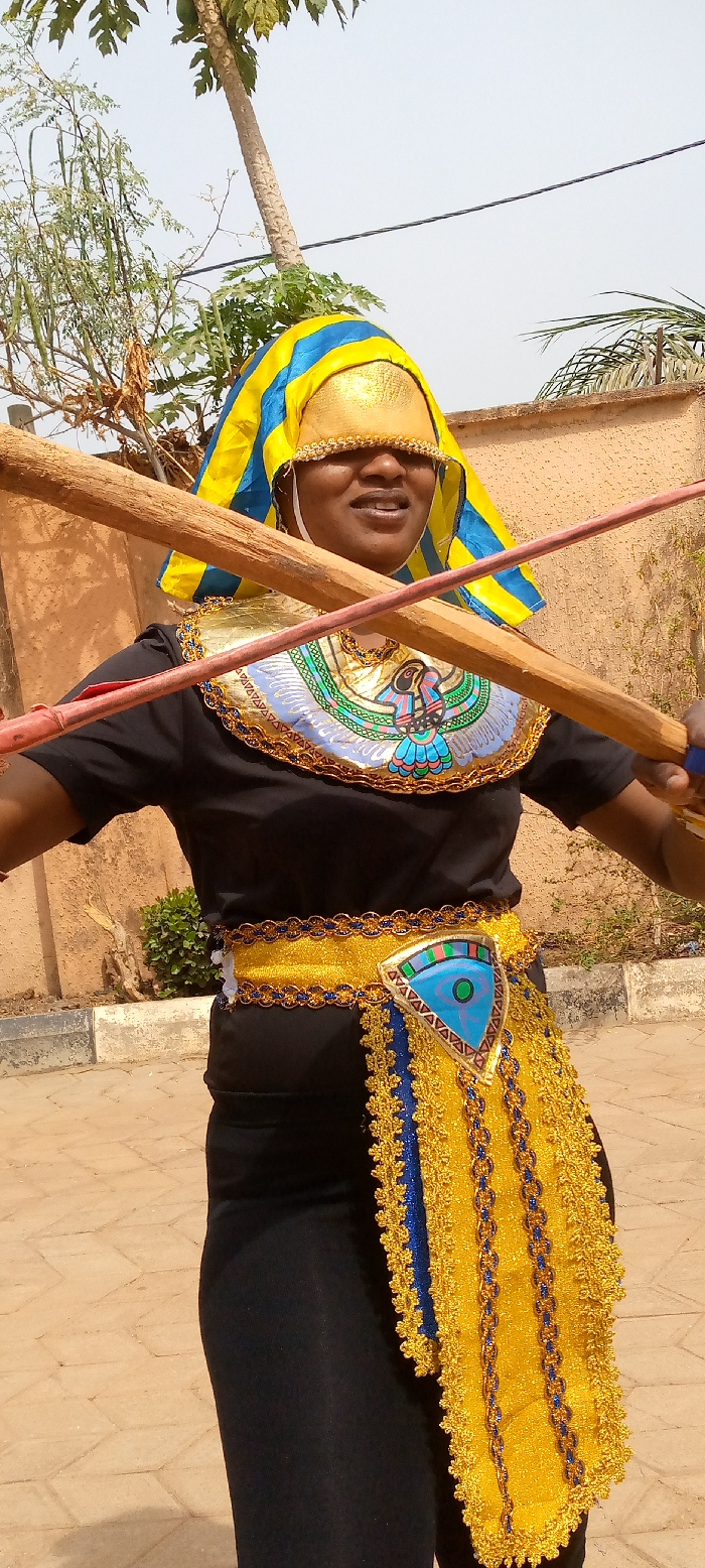 An adult individual is depicted outdoors, positioned centrally within the frame, against a backdrop consistent with Sabon Tasha, Nigeria. The subject wears a black short-sleeved top and black trousers/leggings, adorned with an elaborate costume. The costume includes a gold and blue striped headpiece, a gold blindfold with beaded fringe, a broad gold-colored collar with a multi-colored winged bird motif (resembling an Egyptian Horus), and a gold waist sash featuring a decorative panel with an "Eye of Horus" symbol and gold-embroidered hanging elements. The individual is smiling with an open mouth and holds two wooden objects, one a thicker, unpainted stick and the other a thinner, red-painted stick, crossed in front of their torso. The right hand (viewer's left) grasps the thicker stick. The immediate environment consists of a light brown paved surface underfoot. The background features a light brown masonry wall to the right. Vegetation includes a tall papaya tree with visible green fruit and a moringa tree with long pods to the left, and green palm fronds over the wall to the right. A small green bush is situated near the base of the wall. The sky is clear and light blue, indicating daylight conditions. A dark utility wire traverses the upper right portion of the background.