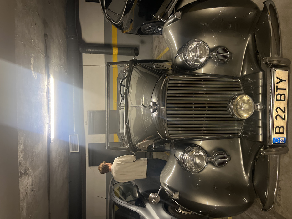 An underground parking garage in the city of Aldoar, Foz do Douro e Nevogilde, Portugal, is illuminated by overhead fluorescent tube lighting. In the foreground, a dark metallic gray vintage convertible car is prominently displayed, facing the viewer. It features a large vertical chrome grille, dual circular headlights on each side, a smaller circular fog light below each main headlight, a chrome bumper, and a winged hood ornament. The front license plate reads "RO B 22 BTY." To the immediate left of this vehicle, the front-left fender and wheel of a silver modern hatchback are partially visible. To the right, slightly in the background, a portion of a black modern SUV's front-right fender and wheel are visible. One individual is present, positioned between the silver hatchback and the vintage car, facing away from the camera. This person, with short light brown hair, is wearing a light-colored (possibly off-white or beige) long-sleeved shirt and dark pants, and appears to be looking down at something held in their hands. The environment consists of a concrete ceiling with exposed pipes and a rectangular ventilation grate. The walls are painted with a light gray lower section and a darker gray upper section, separated by a horizontal yellow stripe. A large vertical grey pipe is visible on the right wall. Numbered parking space indicators ("37," "38" on the wall, "27" on the floor) are present. The floor is light-colored concrete with yellow demarcation lines.