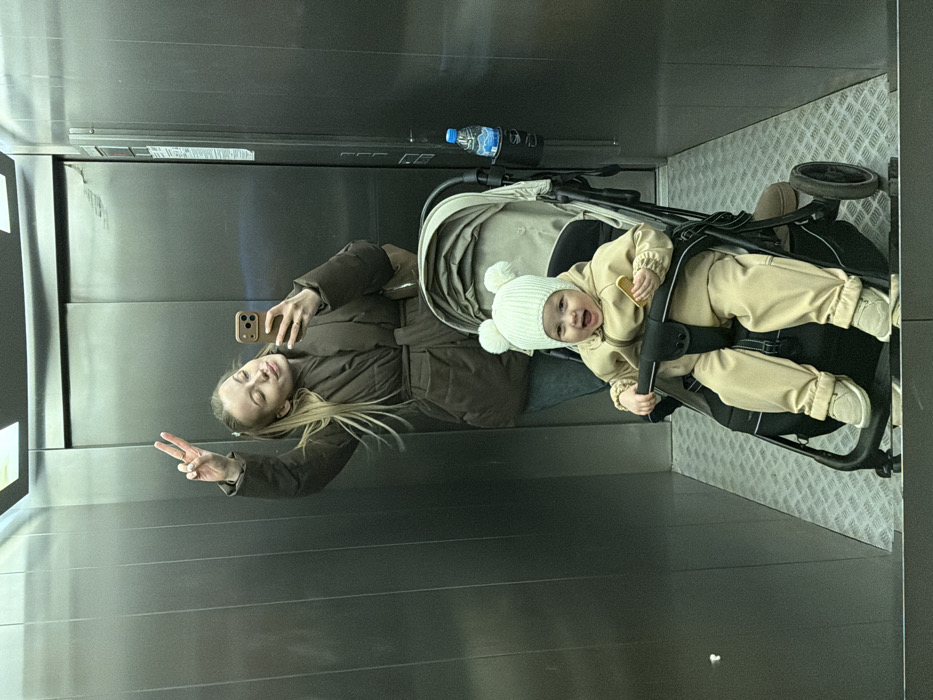 An adult female and a baby/toddler are captured in a mirror selfie within an elevator in the city of Klin, Russia. The elevator interior consists of brushed metallic wall panels and a textured metallic floor. A rectangular light fixture is visible on the ceiling. The adult female, with blonde hair, is wearing a dark brown belted puffer coat and blue jeans. She holds a light-colored smartphone in her right hand to take the photograph, while her left hand is raised, forming a peace sign. She tilts her head slightly and has a subdued smile. Positioned in front of the adult, a baby or toddler sits in a beige and black stroller. The child wears a light beige knitted hat with two pom-poms and a matching zippered tracksuit, along with light-colored shoes. The child is smiling broadly with an open mouth and holds a small, rectangular, light-colored object in their right hand. A plastic water bottle with a blue cap is secured in a black cup holder attached to the right side of the stroller. The metallic elevator doors exhibit visible scuff marks, and a reflection of an elevator control panel is visible on the right-hand door.