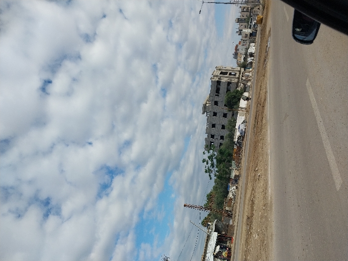 An outdoor, wide-angle street scene in a-Zawayda, Palestinian Territory, captured under a partially cloudy sky. The foreground features a two-lane asphalt road with a faded white lane marker, observed from the interior of a vehicle, evidenced by a dark side mirror frame in the bottom right. Beyond the road lies an unpaved, uneven dirt shoulder or verge containing scattered debris and areas of disturbed soil. To the left, several small, possibly temporary, structures with corrugated metal roofs are visible. Further right, a tall, red and white striped pole stands upright, resembling a barrier or gate. The central focus is a large, multi-story concrete building, approximately five floors tall, appearing either unfinished or damaged, characterized by numerous empty rectangular window openings and an unrendered facade. A white vehicle is partially obscured in the dirt in front of this structure. One individual, dressed in dark clothing, walks from right to left on the dirt path in front of the large building. Sparse green trees and bushes are situated between the road and the buildings. The background reveals additional residential or commercial structures, some appearing incomplete, and a street lamp pole on the far right. The sky is filled with numerous white cumulus clouds against patches of blue.