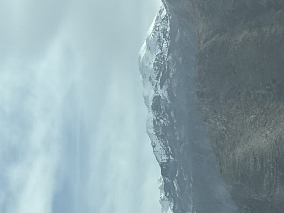 The image displays a mountainous landscape attributed to the city of Klopot, Montenegro. The upper section features a light blue-grey overcast sky. Below, a distant mountain range is visible, its higher elevations heavily covered in white snow, interspersed with darker, exposed rock or sparse vegetation. In the midground and foreground, darker, rugged hills or lower mountain slopes display visible textural variations and muted, possibly sparse, vegetation. No individuals, man-made structures, or specific objects are present. The scene is illuminated by diffused daylight.