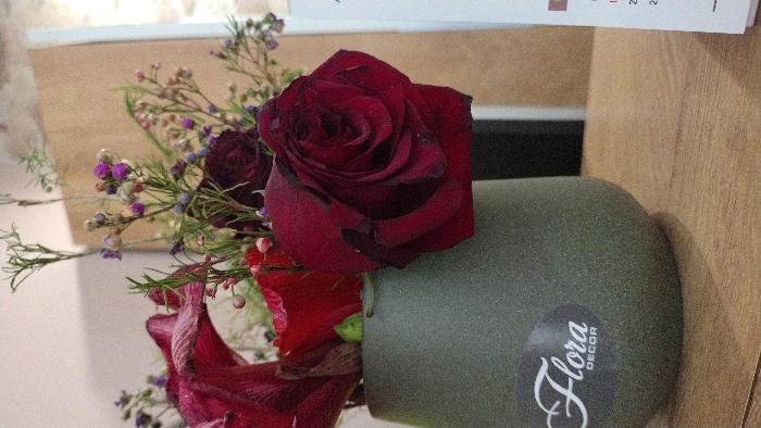 The image displays a close-up, eye-level view of a floral arrangement situated on a light brown wooden surface. The central object is an olive-green, textured vase with a slightly rounded base and tapering neck. A black oval sticker, bearing the white script logo "Flora DECOR," is affixed to the lower left side of the vase. The arrangement within the vase consists primarily of dark red roses, with one prominent, deeply hued rose positioned towards the right front. Other red flowers, some resembling open roses, are also visible, intermingled with slender green foliage and delicate filler flowers. These filler flowers present in shades of purple, white, and pinkish-red. The wooden surface exhibits a visible grain pattern. In the background, to the right of the vase, a portion of a white vertical card or paper with unidentifiable dark text or numbering is partially visible. The background beyond the immediate objects is softly blurred, revealing a light beige or off-white wall surface and a dark, vertical architectural element on the right. Based on the "Flora DECOR" branding, the scene is located within or associated with a Flora Decor establishment in Varna, Bulgaria.