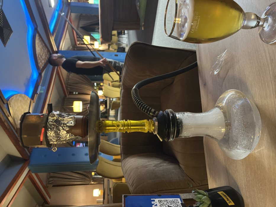 The image depicts an indoor scene within a lounge or bar in Plovdiv, Bulgaria. In the immediate foreground, a light-colored wooden table displays several objects. A clear glass hookah, featuring a frosted base containing visible vapor, a yellow stem, and a black hose, is centrally positioned. Its charcoal bowl, wrapped in aluminum foil, contains glowing red embers. To the hookah's right, a stemmed glass holds a light amber, foamy beverage. Between the hookah and the glass, a small, translucent white object rests on the table. To the hookah's left, a black cylindrical pot with a green succulent plant bears a "Schweppes" sticker, adjacent to a blue menu stand displaying a QR code. Behind the table, a segment of a brown upholstered armchair is visible. In the mid-background, a bearded male, wearing a black t-shirt and camouflage-patterned pants, stands next to a billiard table, holding a pool cue. The background environment includes multiple yellow upholstered armchairs, warm-toned pendant lights, and a ceiling design featuring blue neon accent lighting within curved architectural recesses, interspersed with exposed wooden beams. The overall lighting is dim, suggesting an evening ambiance.