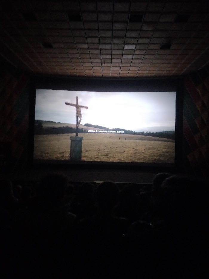 The image displays the interior of a darkened movie theater in the city of Unknown, Unknown. A wide cinematic screen occupies the central and upper portion of the frame, showing an outdoor scene. This scene depicts a wooden crucifix with a corpus, mounted on a stone pedestal, standing in the foreground of a large, barren field. Distant hills covered with dark foliage are visible under a bright, overcast sky. Subtitles reading "VÄČŠINA SLOVÁKOV HO POHRDÁ ROZUMICE" are present near the bottom of the screen. Above the screen, a tiled ceiling with square, textured panels is illuminated by ambient light. Geometric, patterned wall panels are visible on the left and right sides of the screen. In the lower half of the image, the dark silhouettes of multiple individuals, identified as an audience, are visible from the shoulders up, seated and facing the screen. Their forms are indistinct due to the low lighting, indicating passive observation of the film. No specific actions or interactions among the audience members are discernible.