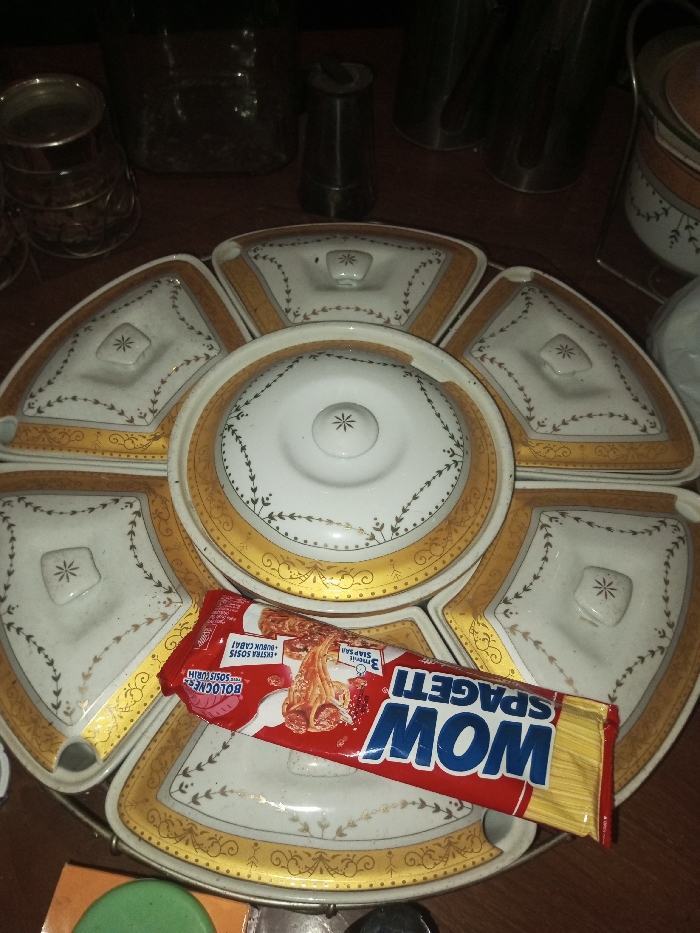The scene depicts an indoor, dimly lit setting in Ciherang, Indonesia, likely a kitchen or dining area. The primary focus is a segmented, lidded serving dish made of white ceramic or porcelain, adorned with gold trim and a leaf-patterned design. This dish consists of a central circular lidded compartment surrounded by five radially arranged, triangular lidded compartments, each featuring a star-shaped handle. Resting diagonally across the lower right portion of this serving dish is a red and white packet of "WOW SPAGETI," which indicates "BOLOGNESE SAUS" and "EXTRA SOSIS + BUBUK CABAI" for "3 porsi siap saji." The serving dish and packet are situated on a dark wooden surface. In the blurred, dimly lit background, various indistinct objects are visible, including a clear glass jar, a wire-mesh cylindrical holder, and several dark, metallic-appearing cylindrical containers or kitchen implements. No individuals are present.